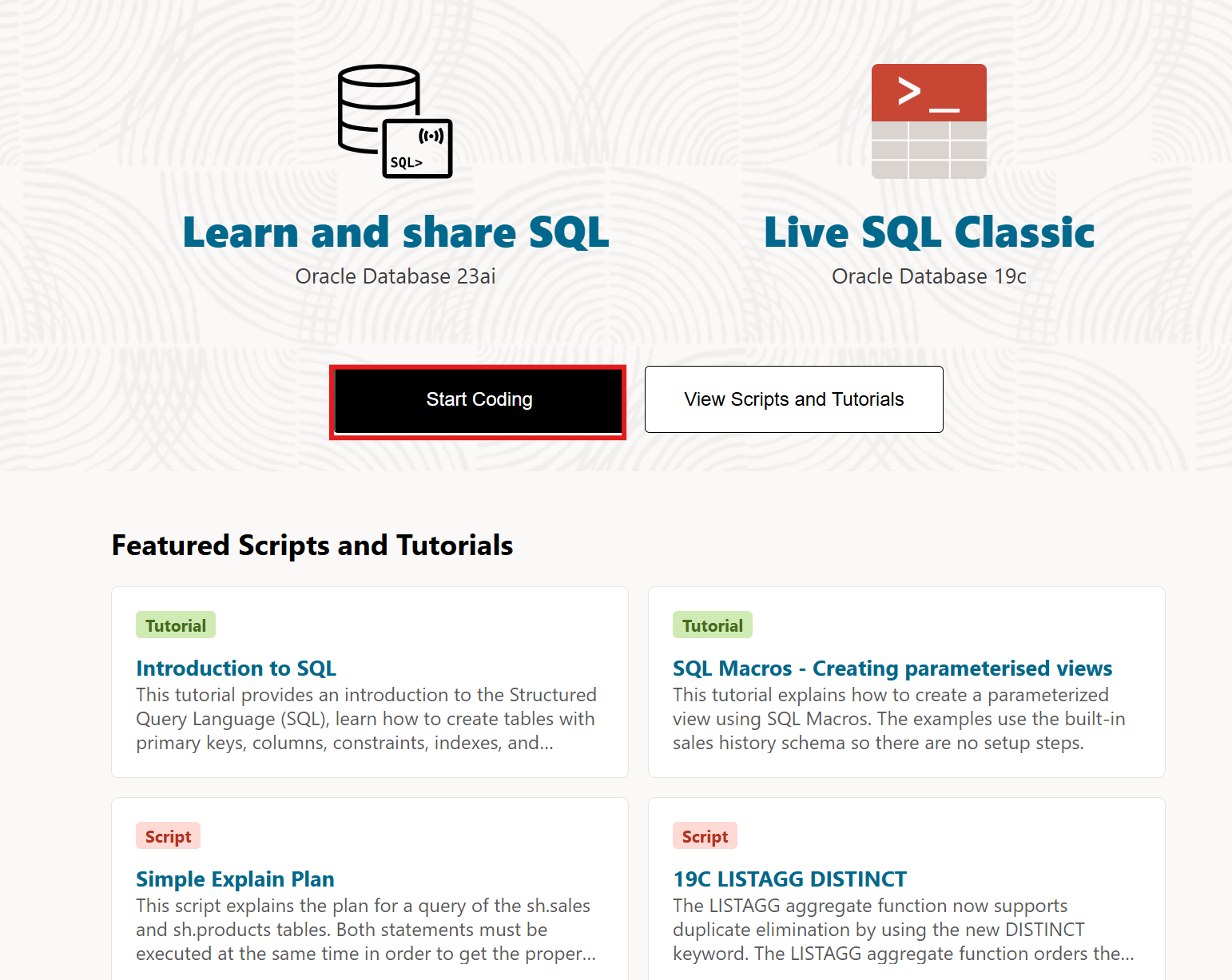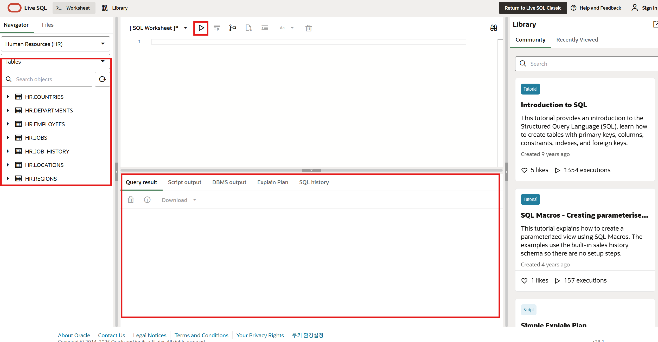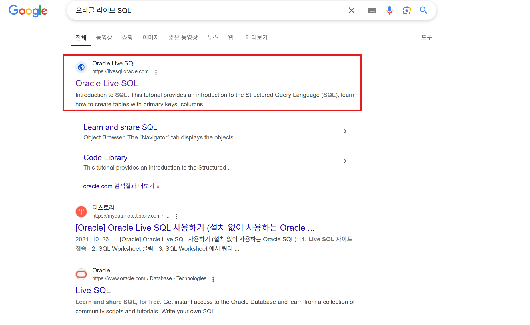 오라클 라이브 SQL 을 검색한다.