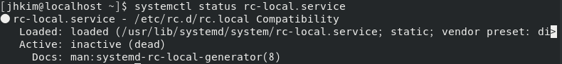1. "rc.local" 파일의 실행 권항을 부여하기 위해 아래의 명령어를 입력합니다. # chmod +x /etc/rc.d/rc.local 2. 아래의 명령어로 "rc-local.service"의 상태를 확인합니다. # systemctl status rc-local.servi..