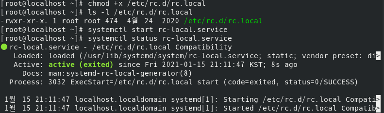 CentOS 7버전 부터 systemd가 담당하고 있다고 한다. 그리고 이 systemd가 rc.local을 실행시켜준다. 따라서 rc.local에 등록을 해주면 부팅 시 실행을 시켜준다.
